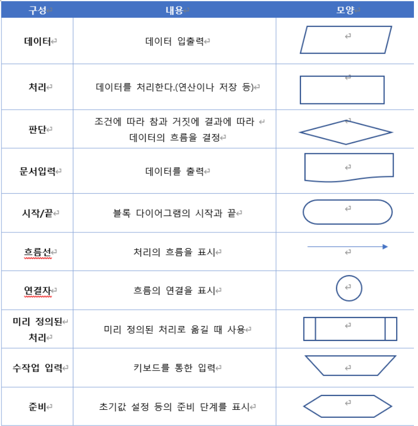 - 판단 : 하나의 입구와 하나 이상을 선택하는 출구가 있으며 판단 기호 안에 정의한 조건을 평가하여 하나의 출구를 선택하는 기능