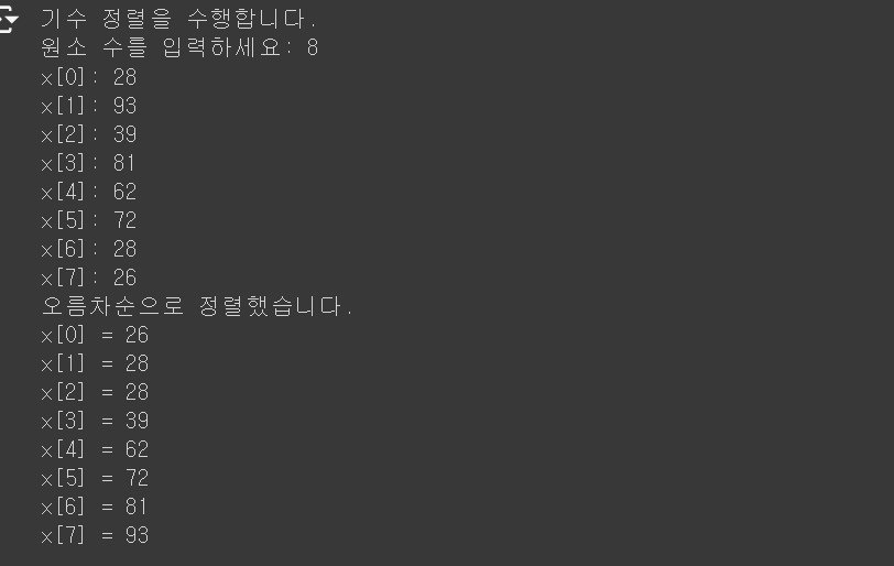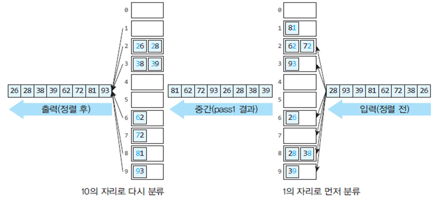 - 키 값의 자리수만큼 기수정렬 반복(키 값의 일의 자리 대해 기수정렬 -> 키 값의 십의 자리에 대해 기수정렬...)