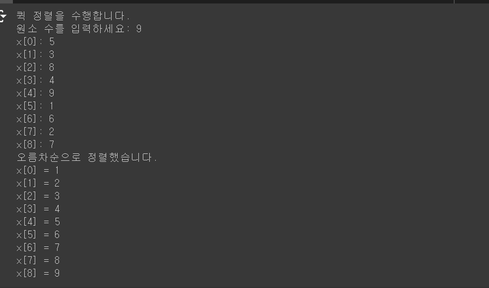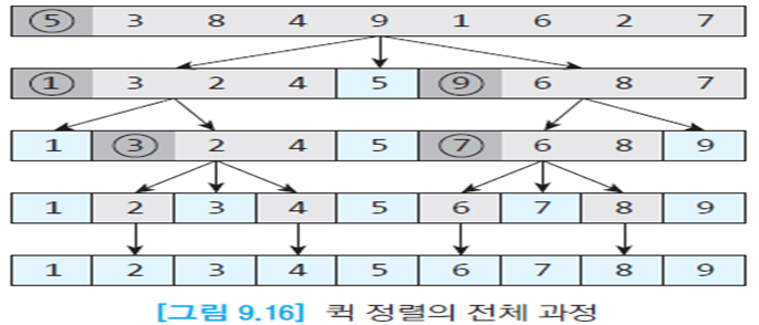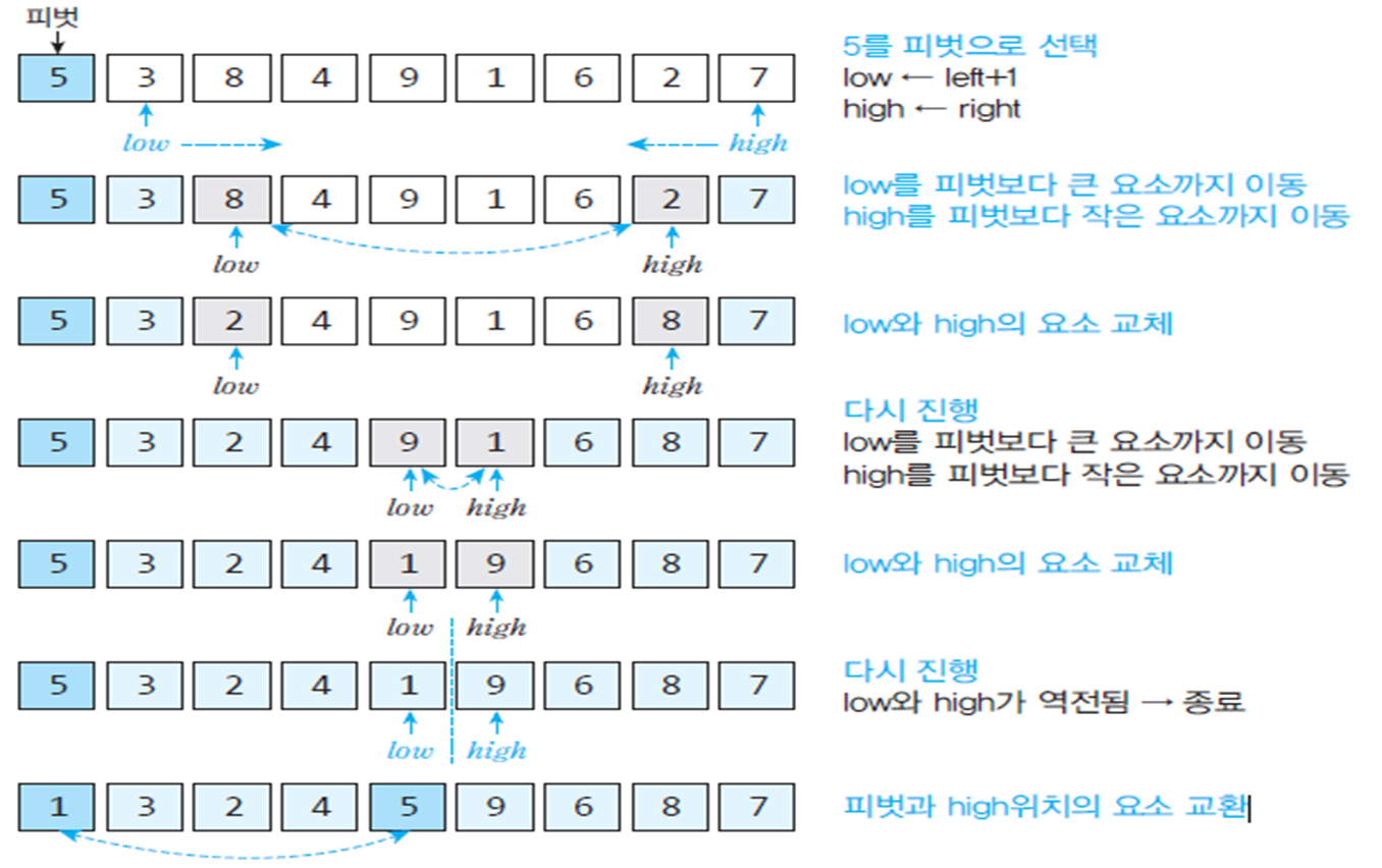 - 각각의 부분리스트를 다시 퀵정렬(순환호출)