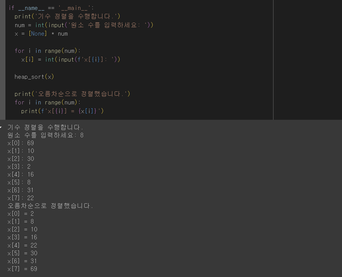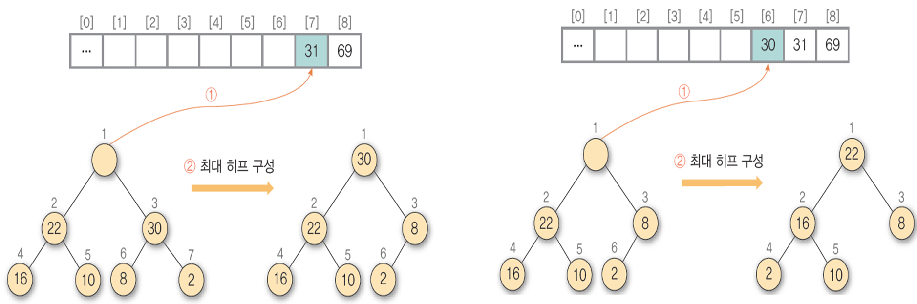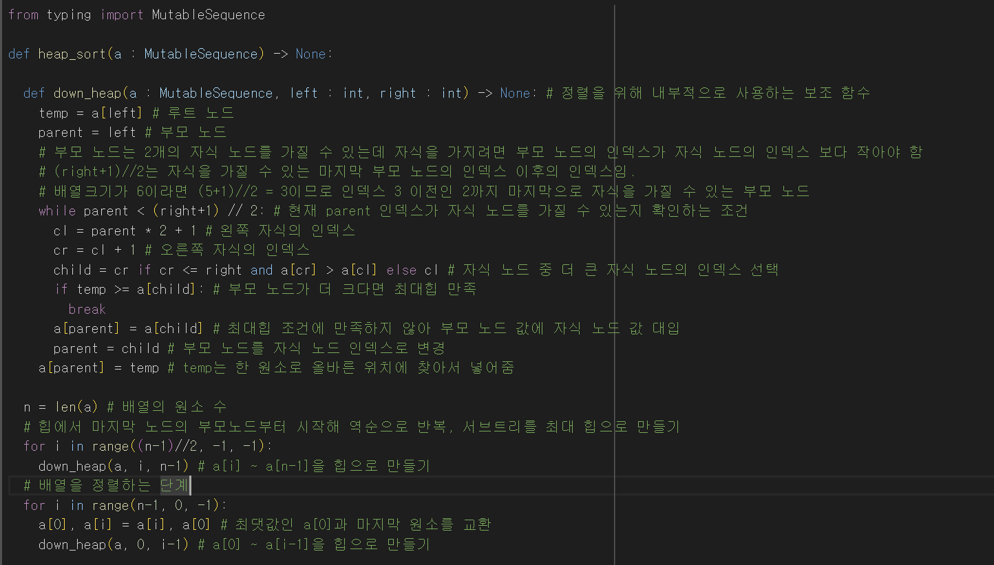 - 최대 히프에 대해 원소의 개수만큼 삭제 연산을 수행하고 내림차순 또는 오름차순으로 정렬을 수행한다.