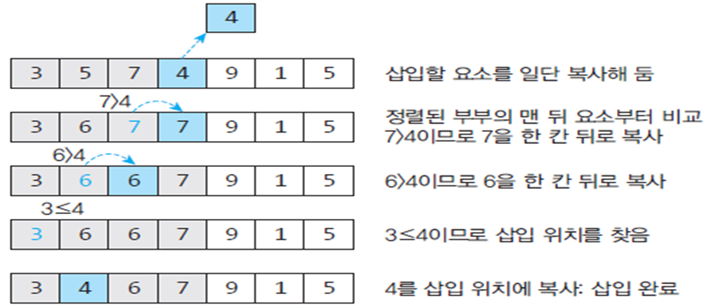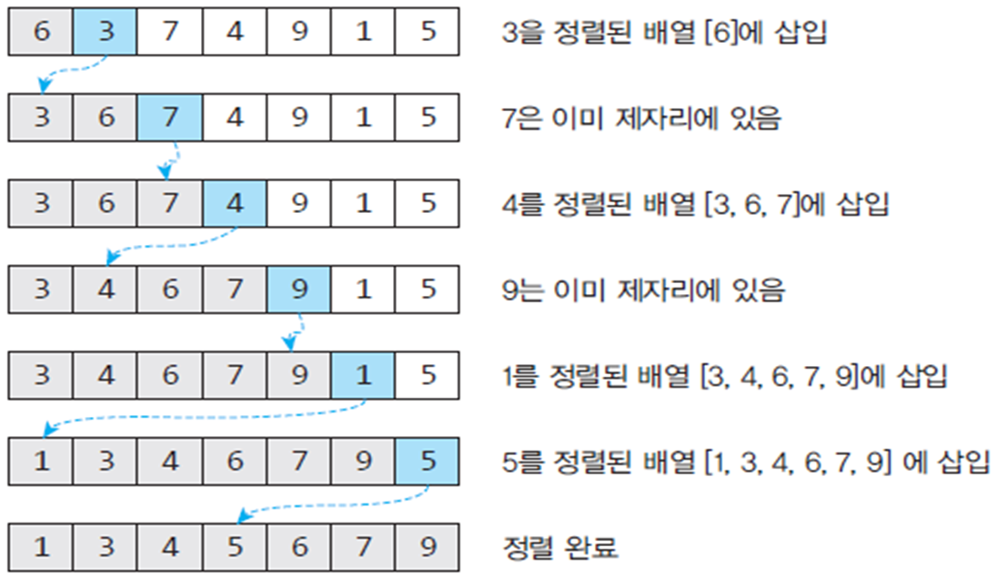 - 정렬되어 있는 부분집합에 정렬할 새로운 원소의 위치 찾아 삽입