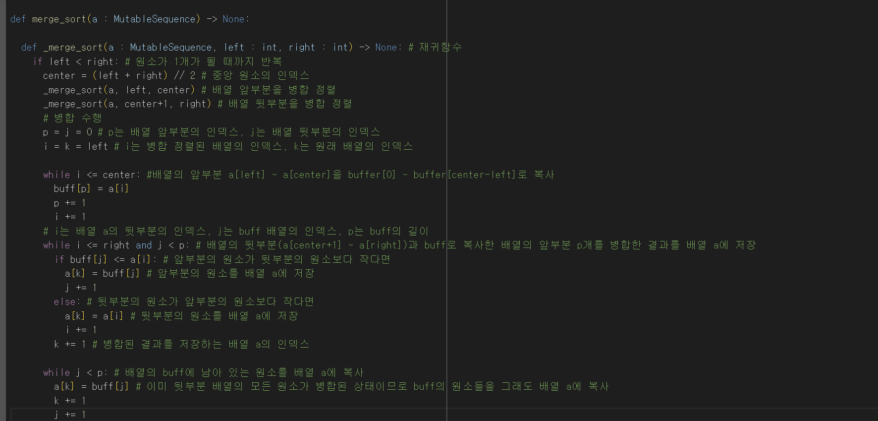 - 하나의 배열이 모두 끝날 때까지 반복하여 마지막으로 남은 배열의 요소를 새로운 배열로 복사-> 병합 완료