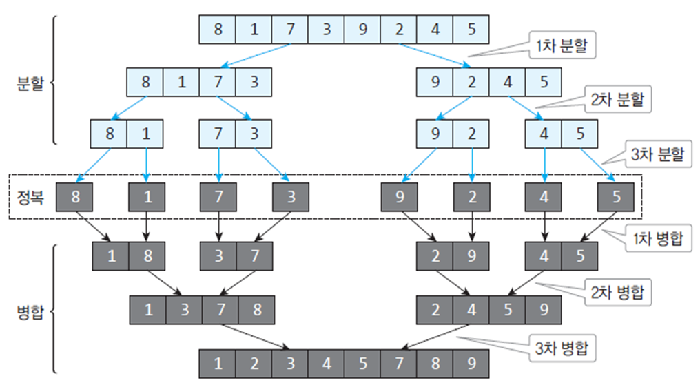 1) 분할 : 입력 배열을 같은 크기의 2개의 부분 배열로 분할