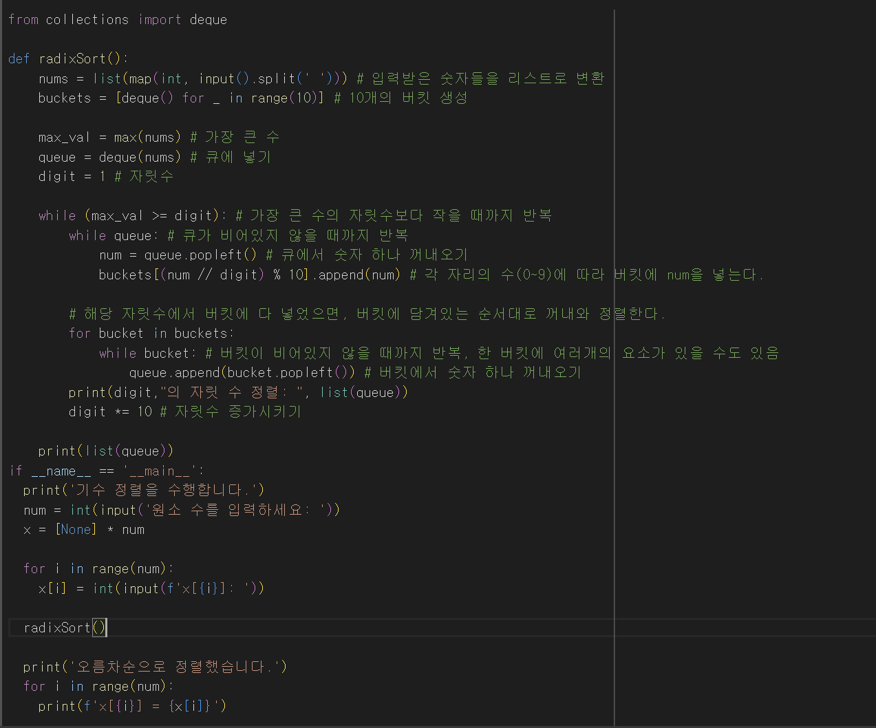 - 버킷에 분배된 원소들을 버킷의 순서대로 꺼내서 다음 단계의 기수 정렬을 수행해야 하므로 큐를 사용하여 버킷을 만듬