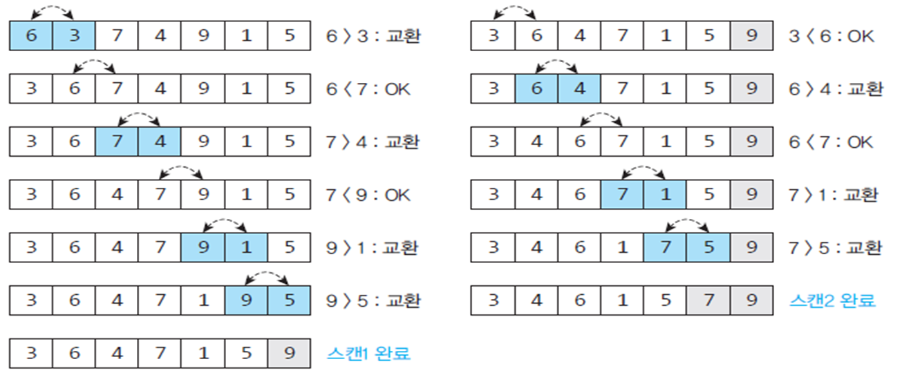 - 비교-교환 과정을 리스트의 왼쪽 끝에서 오른쪽 끝까지 반복 or 리스트의 오른쪽 끝에서 왼쪽 끝까지 반