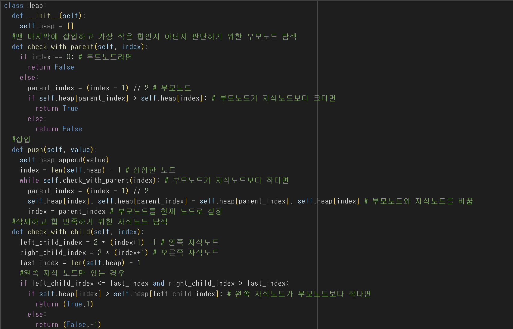 - 힙을 직접구현 할 수도 있지만 파이썬에서는 라이브러리를 제공하기 때문에 아래 사진은 라이브러리 사용한 것이다.