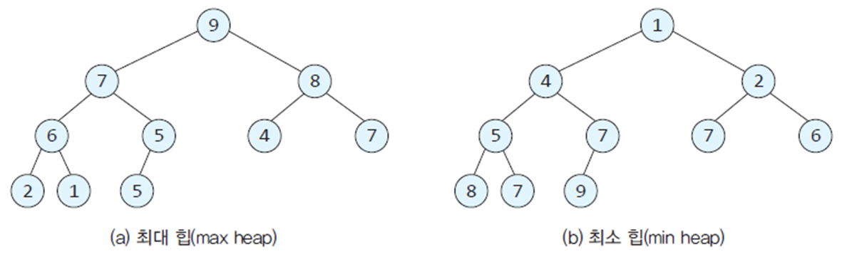 - 최대힙 : 부모의 킷값이 자식의 킷값보다 크거가 같은 완전이진트리