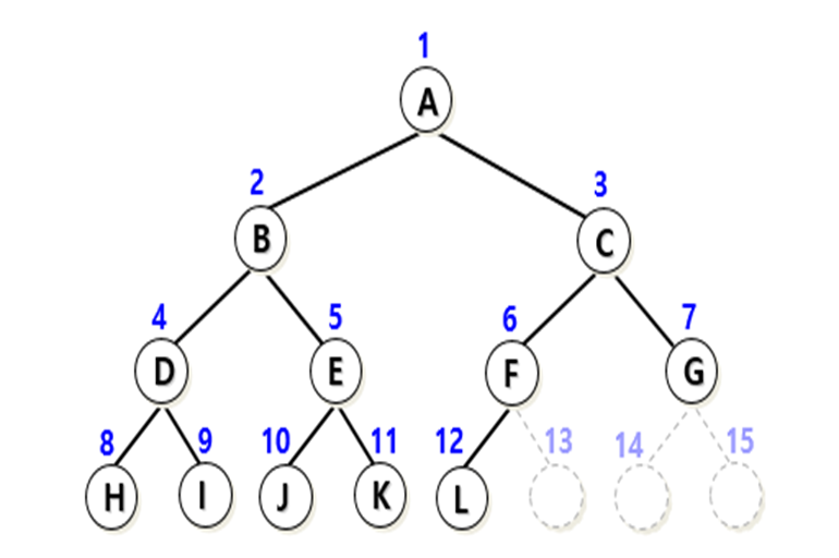 - 완전이진트리 : 높이가 h일 때 레벨1부터 h-1까지는 노드가 모두 채워지며 마지막 레벨 h에서는 노드가 순서대로(중간에 빈 곳이 존재하면 x) 채워지고 높이가 h이고 노드 수가 n개일 때 (단, n < 2^h -1), 노드의 위치가 포화이진트리에서 노드 1번 ~ n번까지의 위치와 완전히 일치하는 트리이다. 하지만 n+1번부터 2^h -1번까지의 노드는 공백노드다