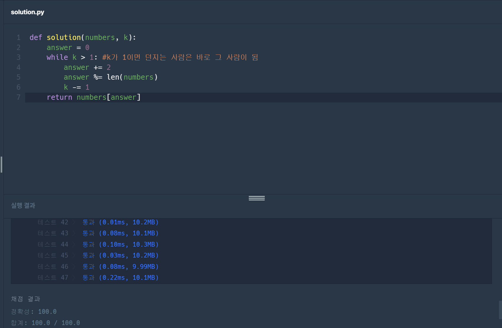 먼저 answer = 0을 넣고 while k > 1 반복문을 선언하였는데 answer는 주어진 배열의 원소를 가리키게 위해 선언하였고 주어진 k만큼 반복하여야 하기에 while k>1을 했는데 k>1인 이유는 k가 1이면 한 번 던지고 끝인데 이 문제에서는 공을 던진 사람을 찾고 싶어하는 문제여서 바로 return numbers[answer]를 해주면 되기에 k가 1보다 크다고 뒀다.