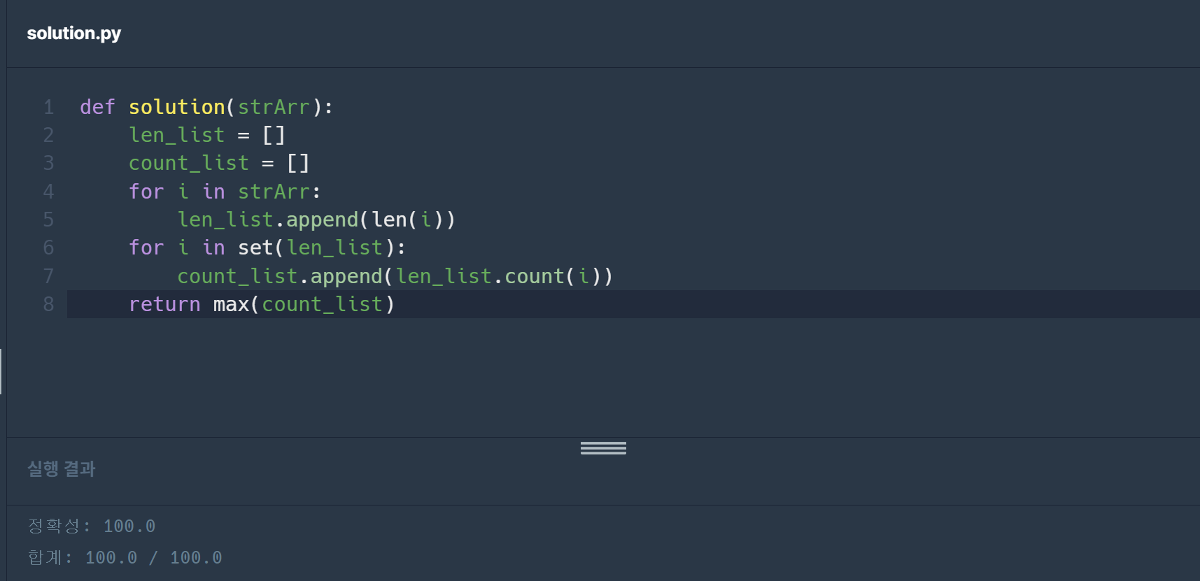 for 반복문을 통해 len_list에 주어진 배열의 문자열의 길이를 먼저 대입하면 문자열의 길이가 여러 개 입력되었을테니 다음 for문을 사용할 때 set(len_list)를 이용해서 중복되는 길이를 제외한 후 그 count_list에 len_list.count(i)를 append해준다.