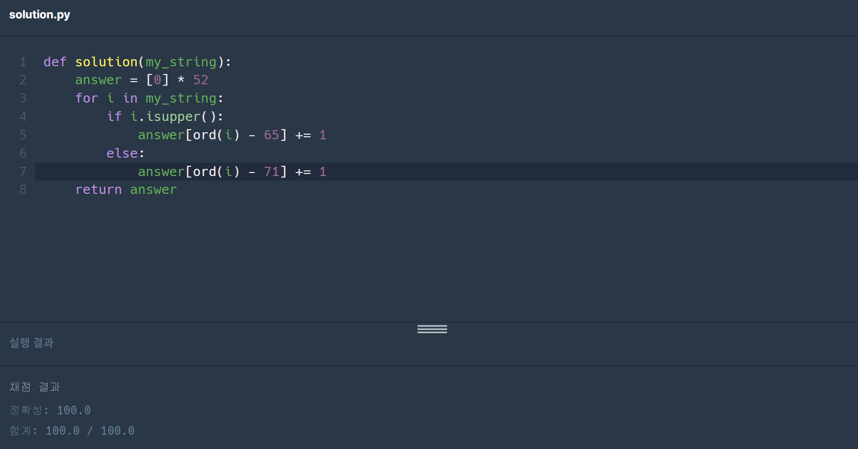 else: 즉, 소문자라면 소문자 a의 아스키코드는 71이기때문에 answer[ord(i)-71] += 1을 해준후 for문을 벗어났을 때 return answer를 해주면 된다.