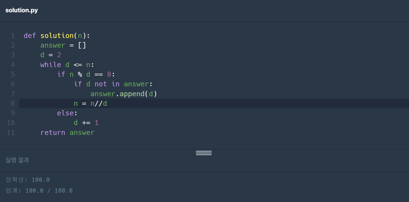 그리고 if n % d == 0이라면 나누어질 수 있는 정수기때문에 n = n//d로 바꿔주고 나눌 수 없다면 d의 값을 1 증가하는 방법으로 문제를 풀어주면 된다.