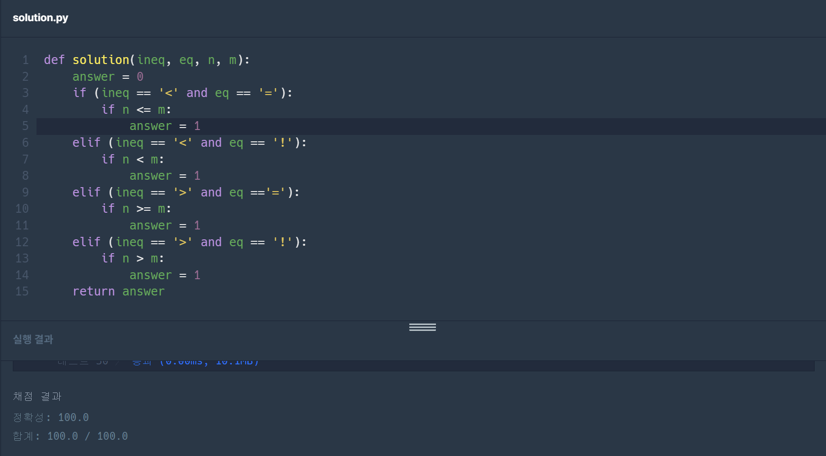 문제의 조건을 토대로 아래 사진처럼 if와 and를 써서 작성하고 그 조건을 만족할 때 실제 부등식도 만족하는지 알아보는 if 부등식을 사용해서 참이라면 answer = 1을 대입해주고 이를 if~elif를 써서 조건에 맞게 작성한 후 어떤 조건에도 성립하지 않았다면 초기에 answer = 0을 넣어줬기때문에 return answer를 해주면 된다.