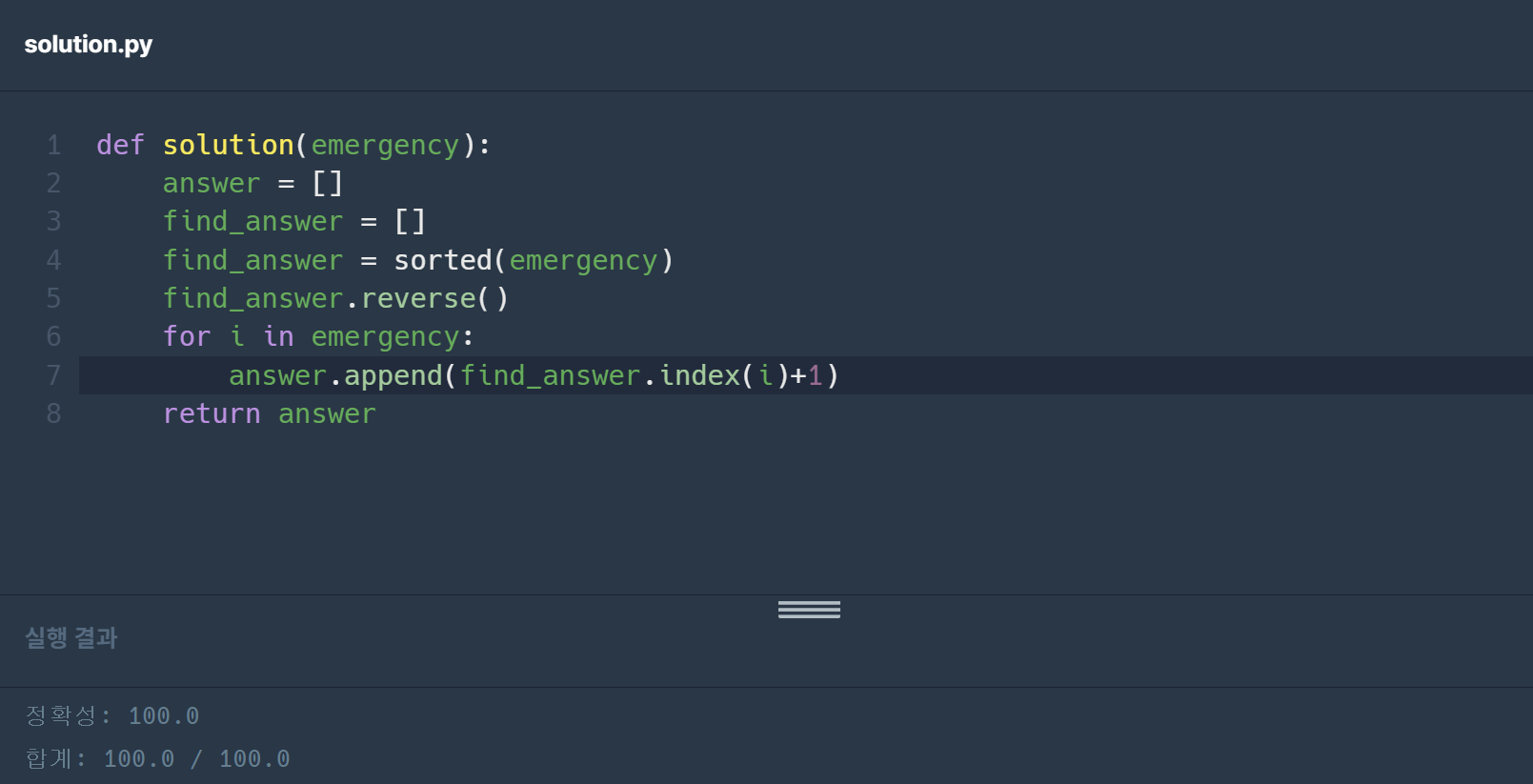 먼저 비어있는 2개의 리스트를 선언해주고 하나의 리스트에 주어진 emergency를 sort 한 것을 대입해준다.(1,4,3 -> 1,3,4)