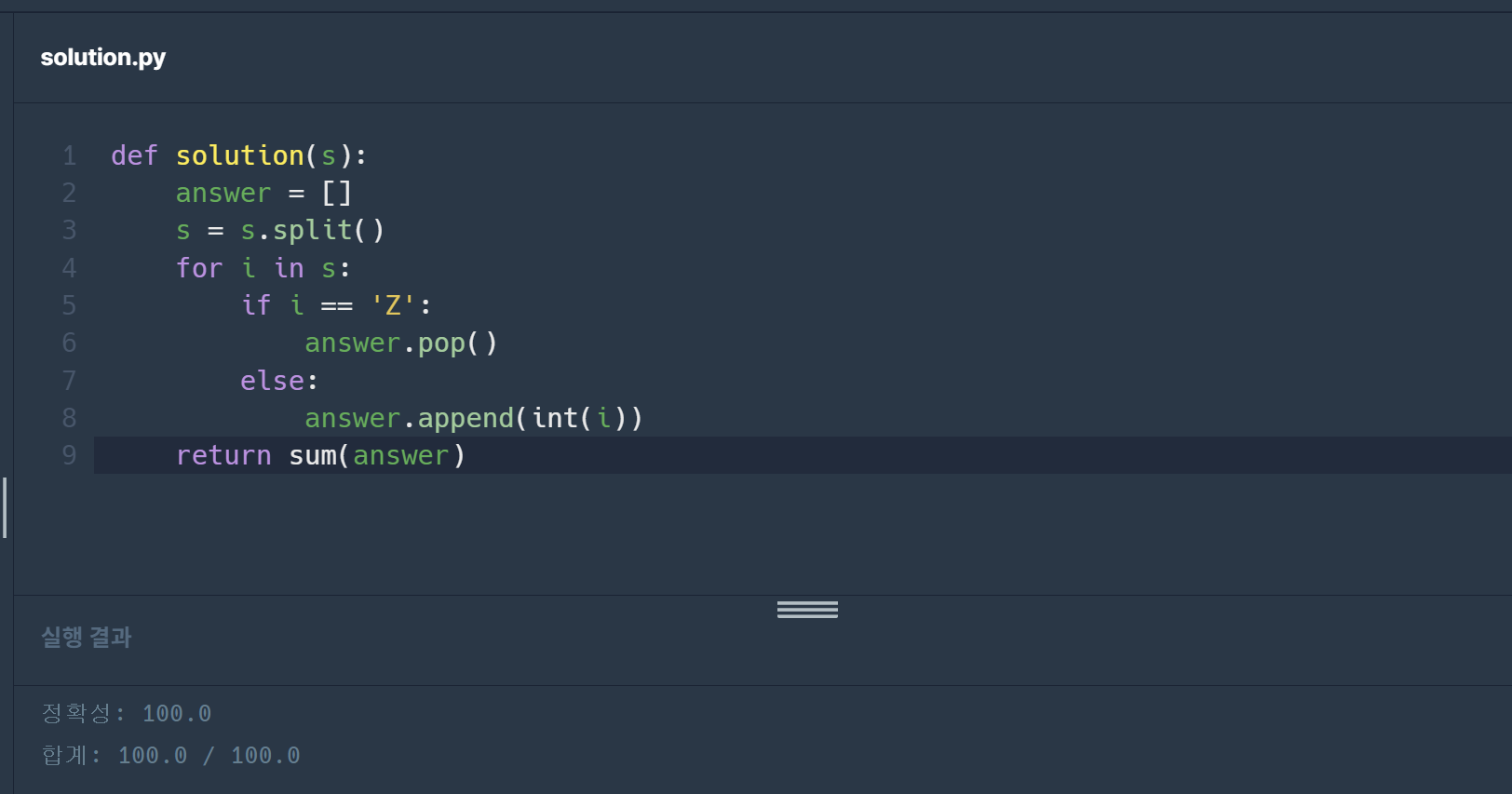 먼저 주어진 문자열을 split()을 이용해 공백으로 구분후 리스트로 만들어 for문을 이용해 s의 원소 하나씩 보기 시작한 후에if~else문을 이용해서 i == 'Z'라면 answer.pop()을 아니라면 answer.append(int(i))를 해주면 되는데 pop은 Z를 만나게 되면 answer에 가장 최근에 append된 원소를 하나만 뽑아서 없애주고 s는 문자열 리스트이기때문에 append해줄 때 int형으로 형변환을 해줘야 한다. return 할 때 문제에서 answer을 더해주라고 했기 때문에 sum(answer)을 해주면 된다.