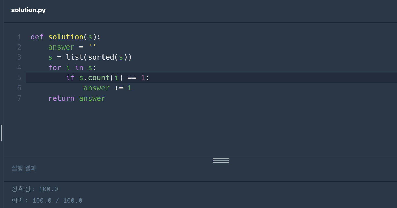 그 후 for문을 이용해 알파벳 하나하나를 살펴보면서 if s.count(i) == 1:을 사용해 s에서 i의 갯수가 1개라면 answer += i를 해준 후 return 해주면 된다.