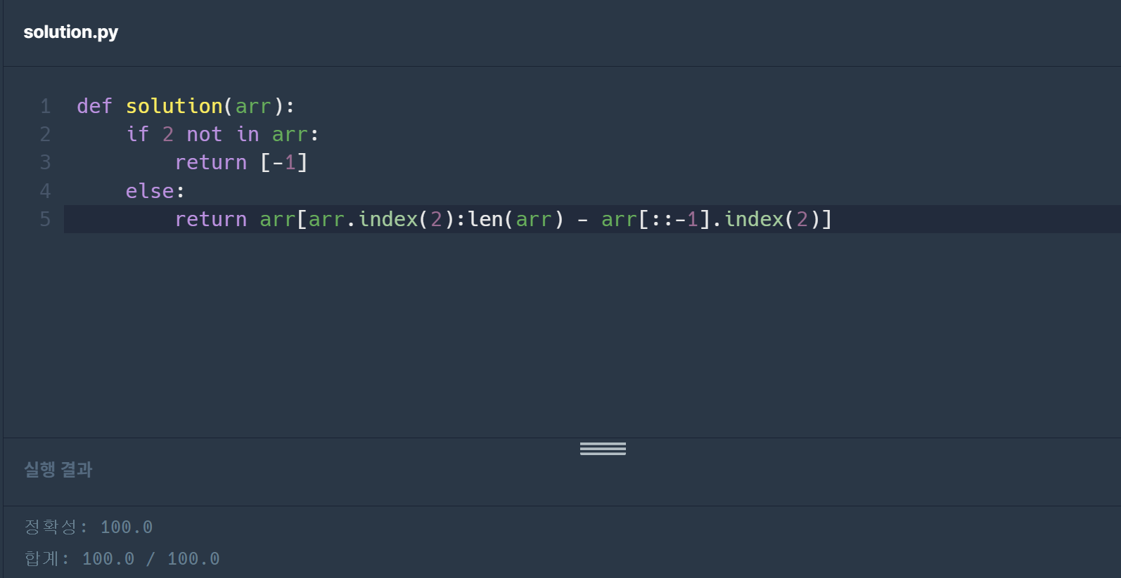 아니라면 arr배열 안에서 arr.index(2), 즉 2의 인덱스 위치를 찾고 그 위치부터 len(arr) - arr[::-1].index(2)까지 return 해줘야 하는데 len(arr) - arr[::-1].index(2)를 해준 이유는 2가 마지막으로 나오는 위치를 찾고 그 위치를 배열의 길이만큼 빼줘야