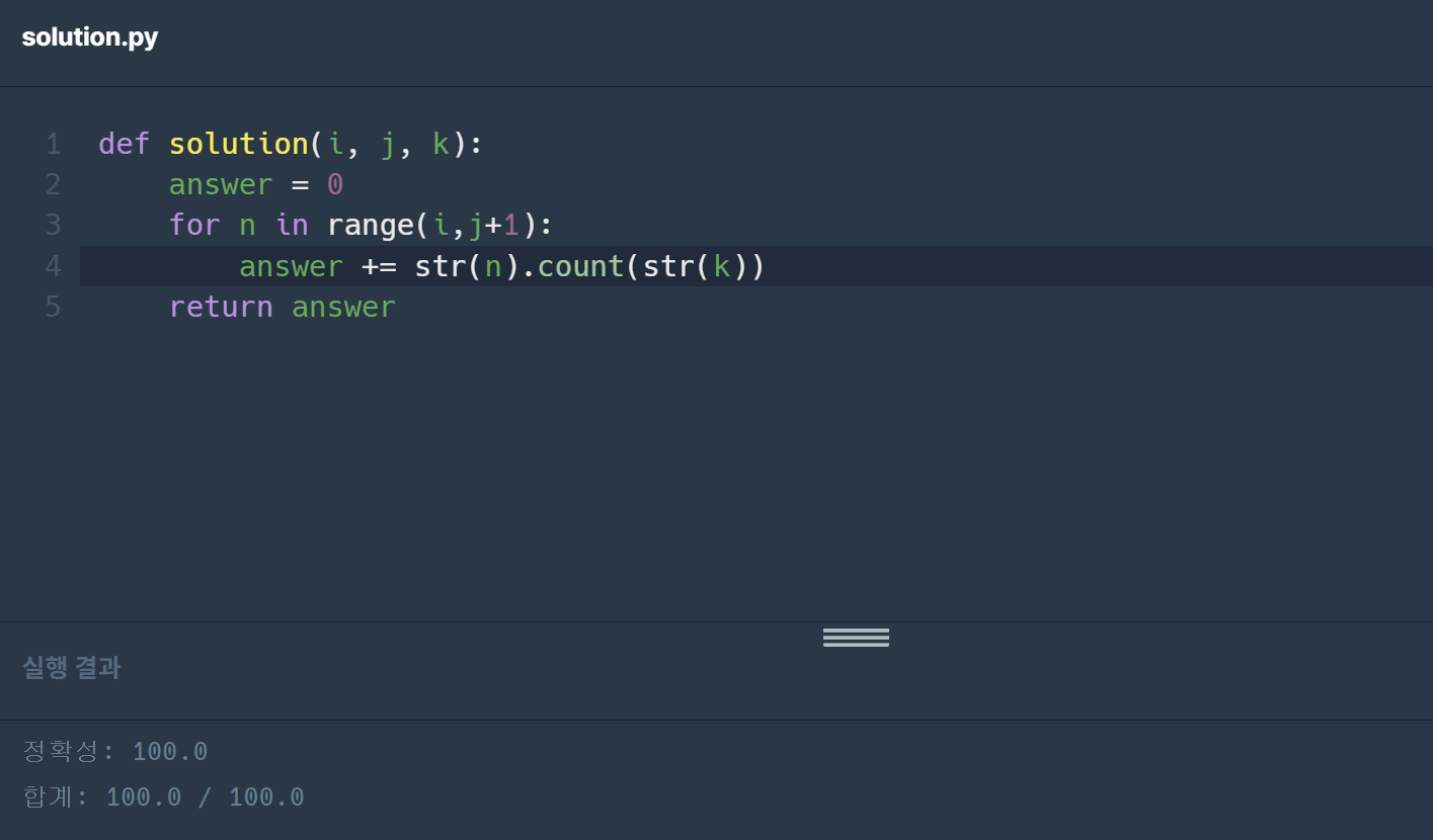 먼저 주어진 범위에서 카운팅을 해야 하므로 for n in range(i, j+1)를 해주고 answer += str(n).count(str(k))를 하게 되면 주어진 범위에서 정수들은 모두 문자열이 되고 그 문자열 안에 있는 str(k)가 카운팅 된다.