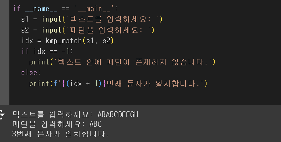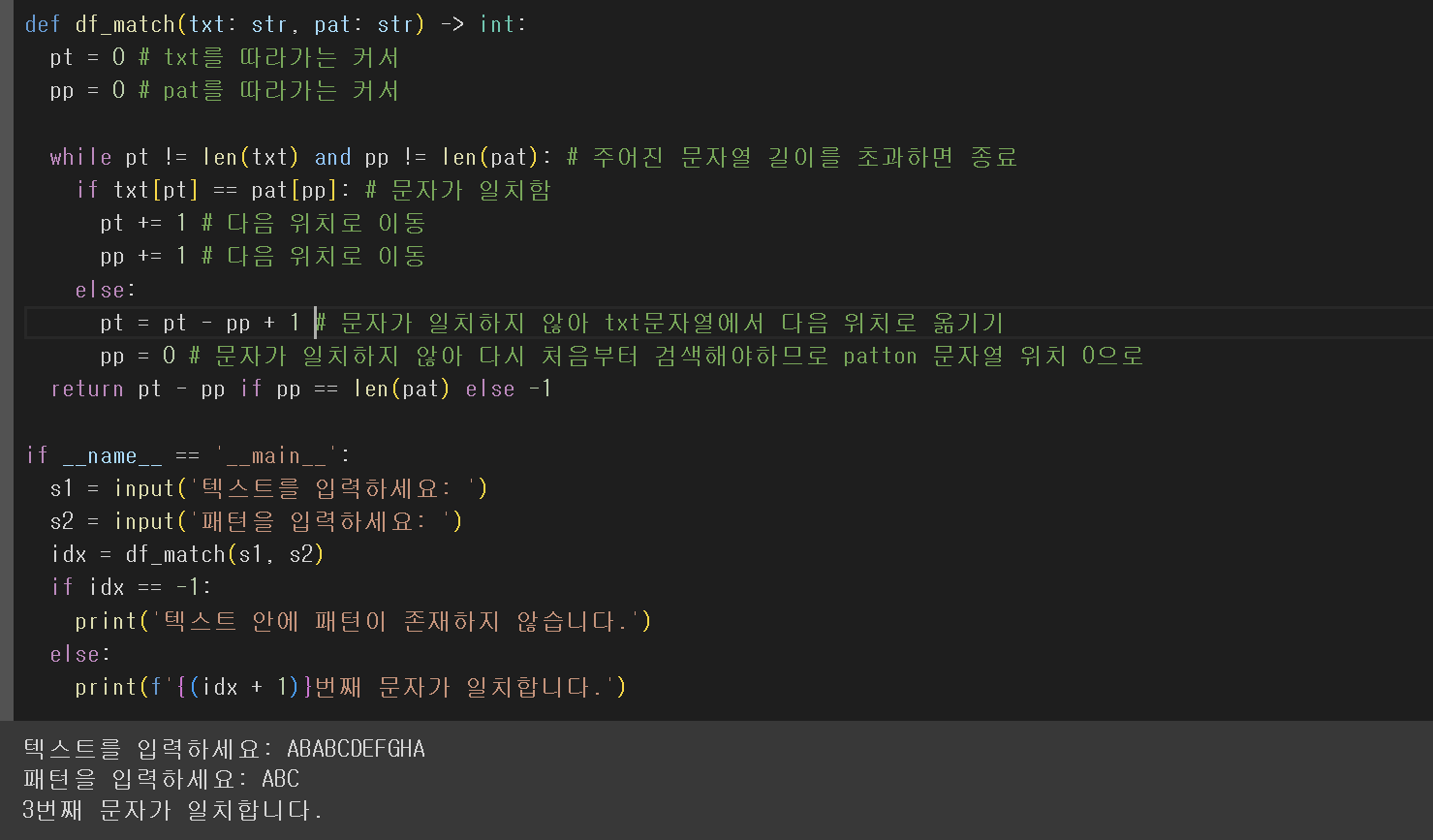 - 검색되는 쪽의 문자열을 텍스트(text), 찾아내는 문자열을 패턴(patton)이라 칭함