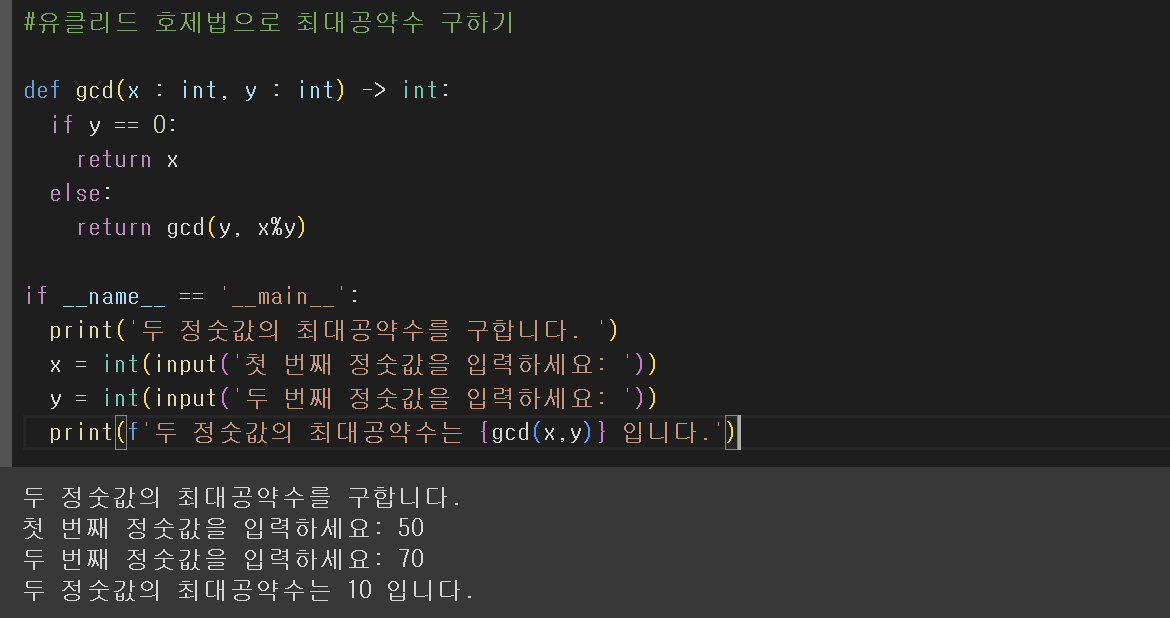 - 파이썬에서는 최대 공약수를 구하는 표준라이브러리 math 모듈에서 gcd()함수를 제공해서 math.gcd(a,b)를 사용해 최대공약수를 구할 수 있고 두 인수가 모두 0이라면 0을 반환