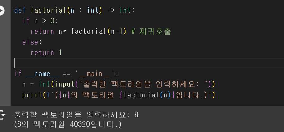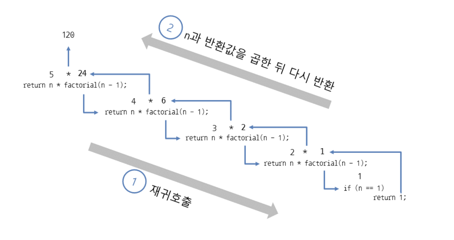 - 자신과 똑같은 함수를 호출하는 방식을 직접재귀
