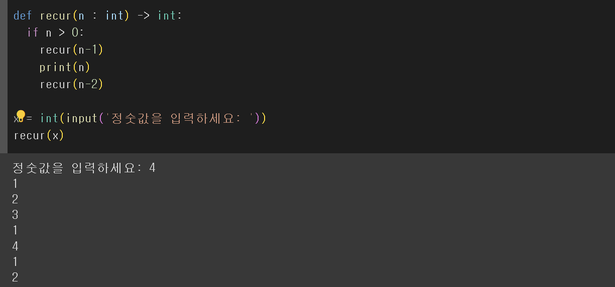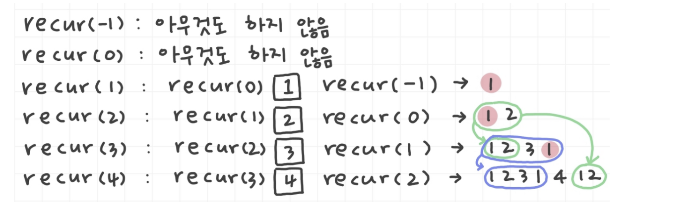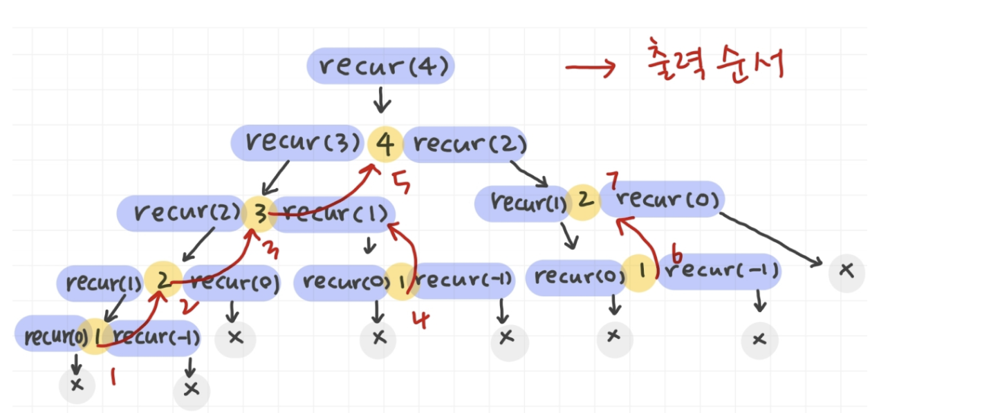 6) recur(2)에서 recur(1)은 이미 실행 됐고 recur(0)은 실행되지 않으므로 2출력해 1->2 순서가 되고 이 과정을 반복