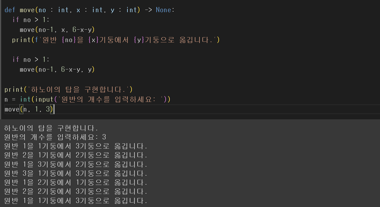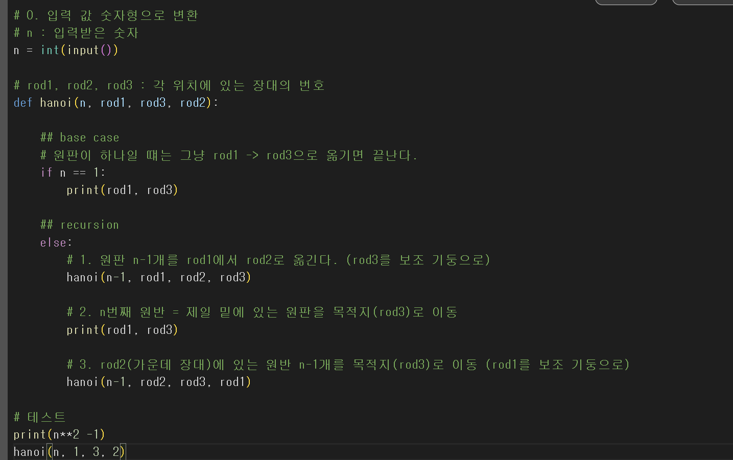 - 작은 원반이 위에, 큰 원반이 아래에 위치하는 규칙을 지키면서 기둥 3개를 이용해서 원반을 옮기는 문제로 재귀 알고리즘 문제에 흔한 예시중 하나이다.