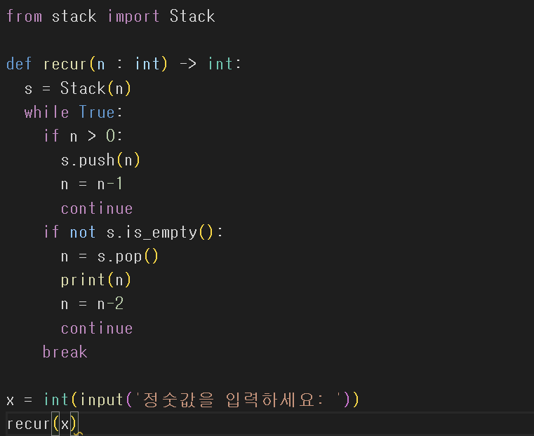 - 위 함수에서 재귀를 제거하려면 현재의 n값을 임시로 저장할 공간과, recur(n-1)의 처리를 완료하고 n값을 출력할 때 임시로 저장했던 n을 꺼내 그 값을 출력해야 하므로 후입선출이다. 따라서 우리는 스택을 이용해 재귀를 제거해야 할 수 있다.