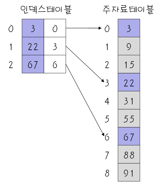 - 인덱스 테이블 : 배열에 저장되어 있는 주 자료리스트 중에서 일정한 간격으로 떨어져 있는 원소들을 발췌하여 저장한 테이블이며 자료가 저장되어있는 배열의 크기가 n이고 인덱스 테이블의 크기가 m일 때 배열에서 n/m 간격으로 떨어져 있는 원소와 그의 인덱스를 인덱스 테이블에 저장함