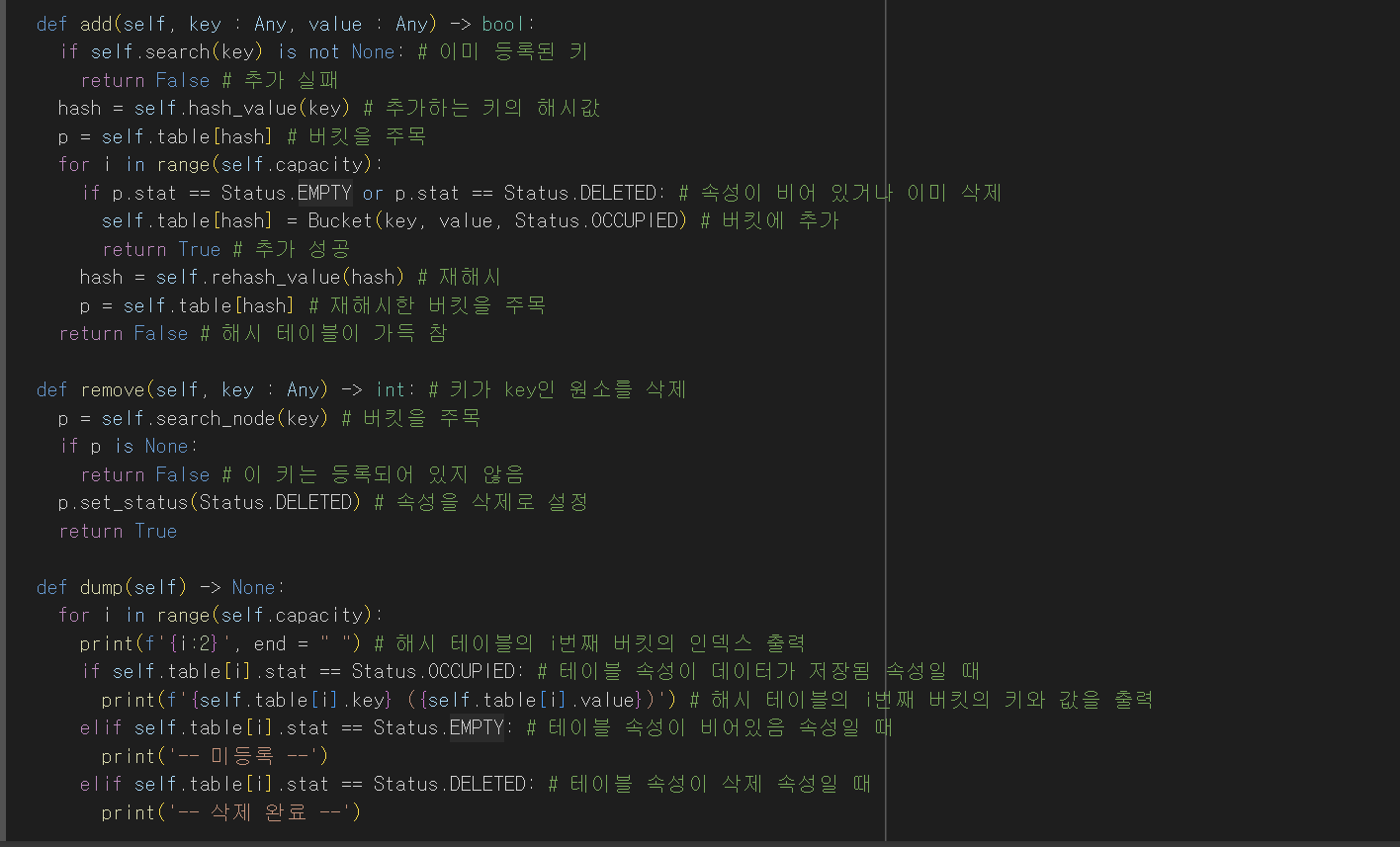 - 충돌 : 서로 다른 키값에 대해서 해싱함수에 의해 주어진 버킷 주소가 같은 경우 충돌이 발생하고 비어있는 슬롯에 동거자 관계로 키값 저장