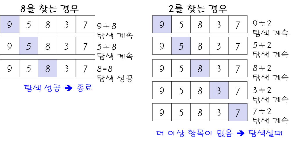 - 배열이나 연결리스트로 구현된 순차자료구조에서 원하는 항목을 찾는 방법