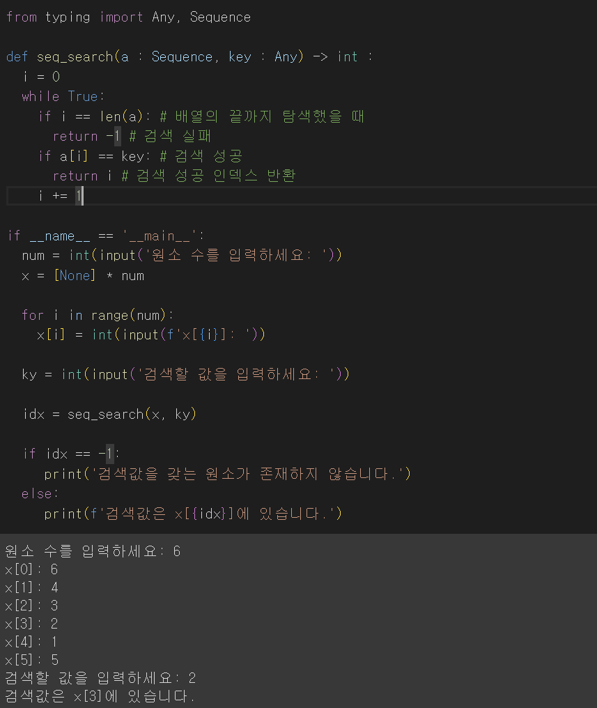 3) 마지막 원소까지 비교하여 키 값에 일치하는 원소가 없거나 찾는 원소가 없으면 검색실패로 -1 반환