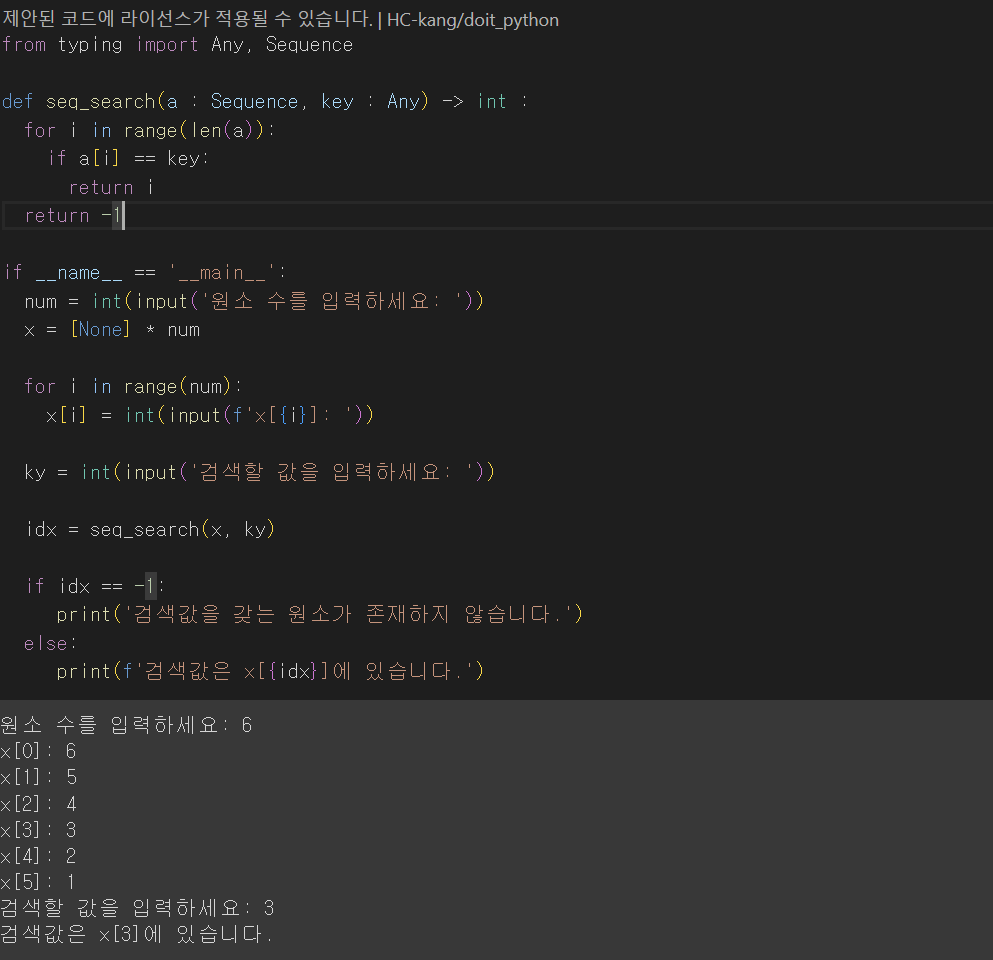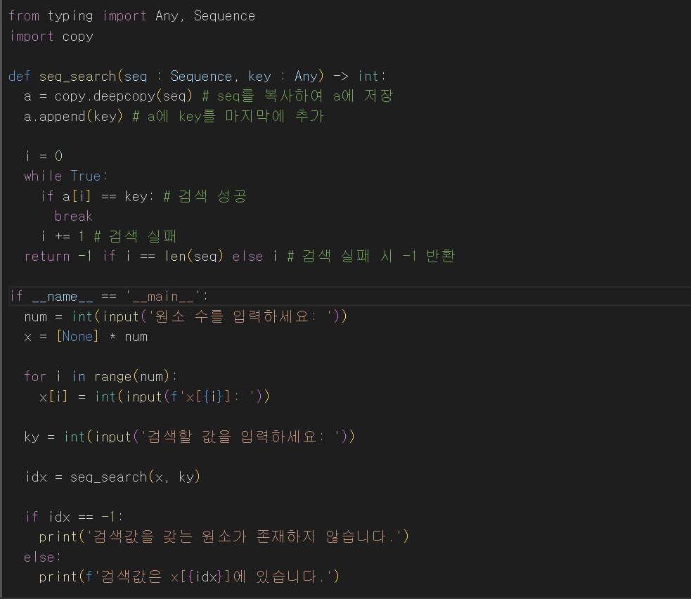 - 선형검색의 종료 조건은 검색할 값을 찾지 못하고 배열의 맨 끝을 지나간 경우와 검색할 값과 같은 원소를 찾는 경우로 2가지인데 단순한 판단이지만 이 과정을 계속 반복하면 종료 조건을 검사하는 비용을 무시할 수 없기에 비용을 반으로 줄이는 방법