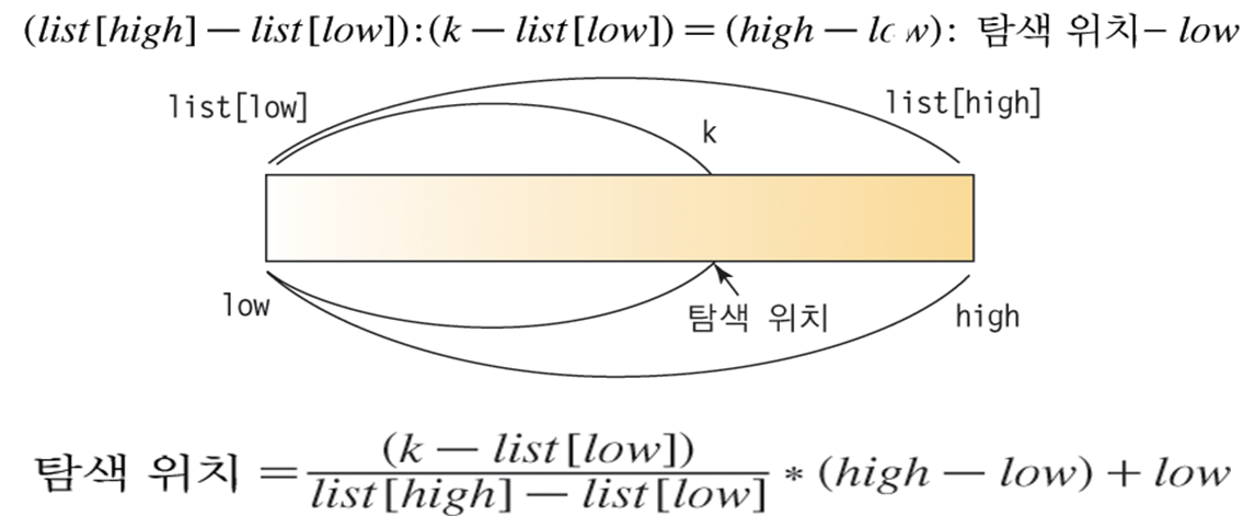 - 탐색키가 존재할 위치를 예측하여 탐색, O(log2^n)