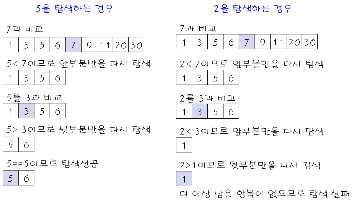 - 키를 찾을 때까지 이진 검색을 순환적으로 반복 수행함으로써 검색범위를 반으로 줄여가면서 더 빠르게 검색