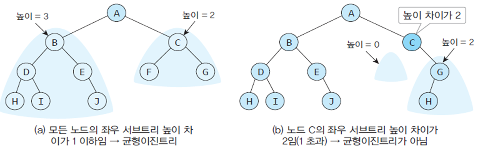 - 균형이진트리 : 모든 노드의 좌우 서브트리 높이 차이가 1이하인 트리