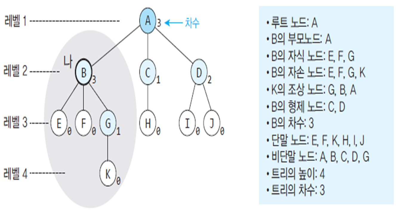 - 트리의 차수 : 트리에 있는 노드의 차수 중에서 가장 큰 값