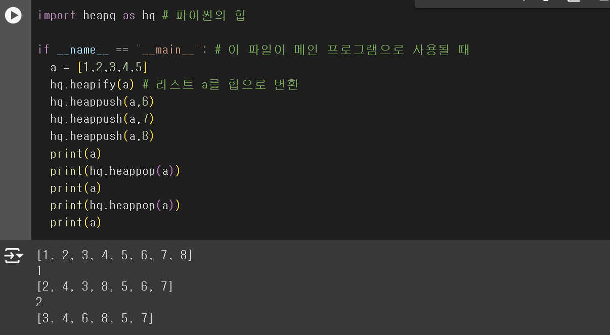 - 힙을 직접구현 할 수도 있지만 파이썬에서는 라이브러리를 제공하기 때문에 아래 사진은 라이브러리 사용한 것이다.