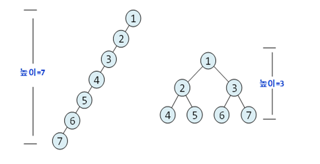 - n개 노드의 이진트리의 높이는 log2(n+1) ~ n이다