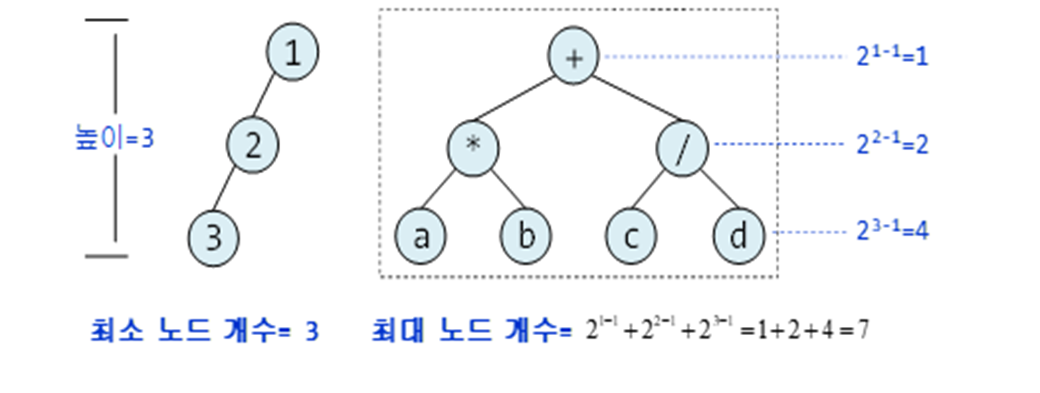 - 높이가 h인 이진트리가 가질 수 있는 노드의 개수는 최소 h ~ 2^h -1개의 노드이다.