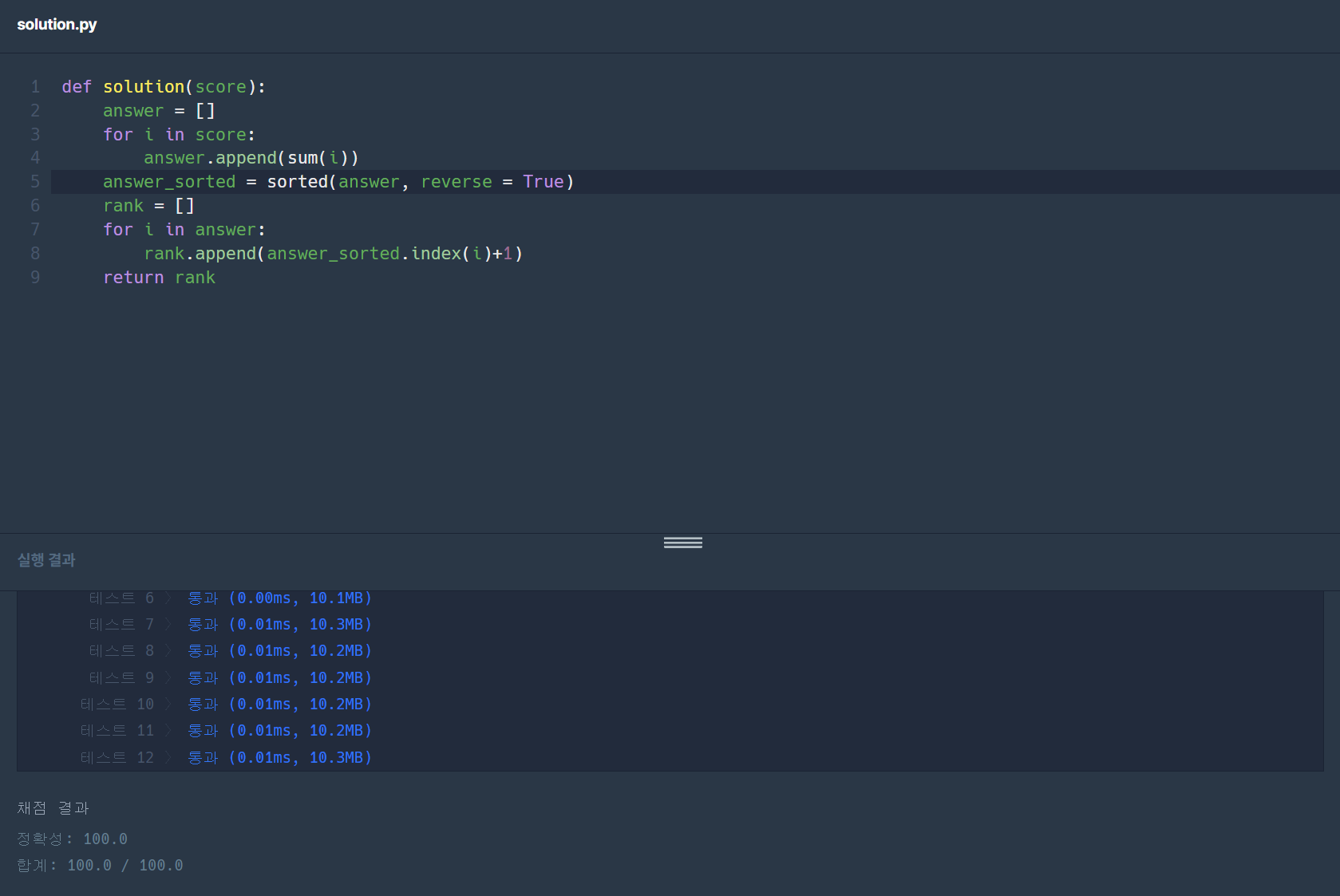for i in answer를 통해 기존 score의 배열 순서대로 1차원 배열의 합을 i가 차례대로 받고 크기를 정렬한 answer_sorted에서 i의 위치를 찾게 되면 i의 랭크가 결정되므로 rank.append(answer_sorted.index(i)+1)를 통해 rank를 정해준다.