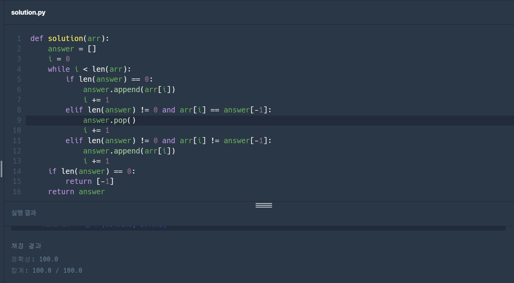 3)의 조건을 보면 answer 배열에 원소가 있고 answer의 마지막 원소가 arr[i]와 같다면 answer 마지막 원소를 제거하고 i에 1를 더하라고 되어있으니 elif len(answer) != 0 and arr[i] == anwer[-1]를 해주고 이 조건에 부합하면 answer.pop()를 해준 후 i += 1를 해주면 된다.