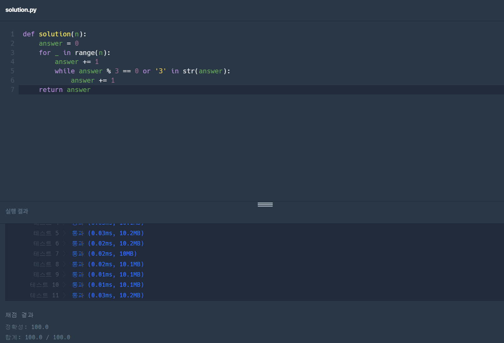 그렇기에 n번 반복할 것이므로 for _ in range(n), answer += 1을 하고 1 증가시켜도 3의 배수이거나 3을 포함하고 있을 수 있기에 if가 아닌 while answer % 3 == 0 or '3' in str(answer), answer += 1를 통해 3의 배수이거나 3을 포함하고 있을 때 answer를 1을 한 번 더 증가하게 되고 반복을 통해 3을 피할 수 있게 된다.
