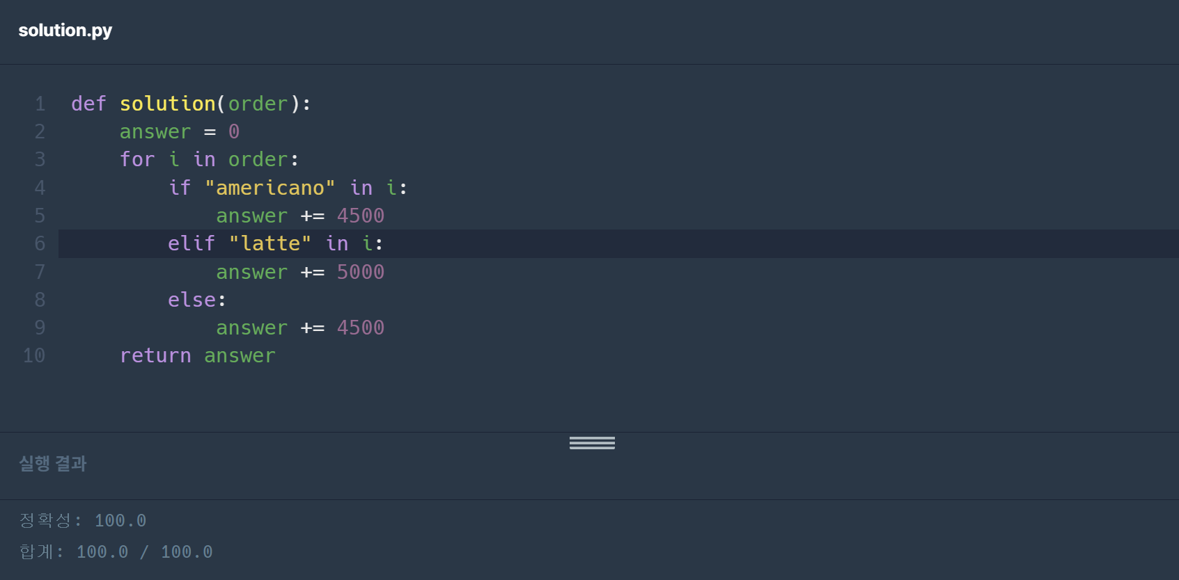 따라서 for i in order를 통해 주어진 커피들을 보고 그 후에 if ~ elif ~ else문을 이용해서 "americano" in i, "latte" in i를 통해 answer에 각 가격을 더해준 후에 return answer를 해주면 된다.