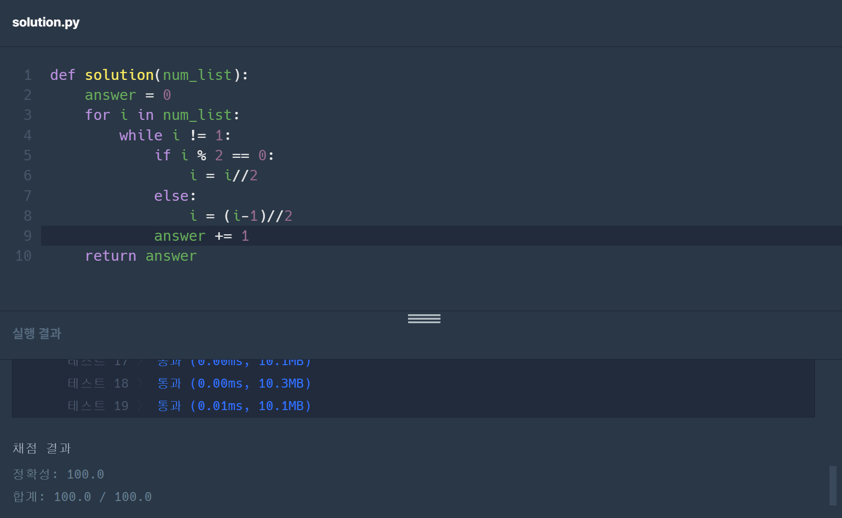 따라서 원소를 하나씩 꺼내오기 위해 for i num_list를 하고 이 배열 원소가 1이 되게 하기 위해 조건을 반복실행 해야 하므로 while i != 1를 써서 짝수 조건, 홀수 조건을 if문으로 입력하고 마지막에 answer += 1를 해주면 된다.