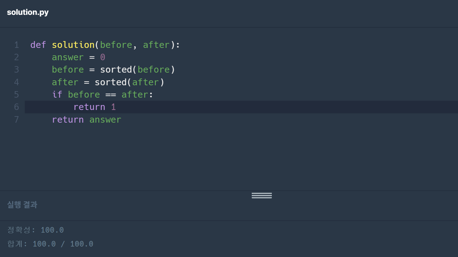먼저 before, start를 sorted 해준 후 그 다음 두 문자열을 비교해서 같다면 1을 아니라면 return answer를 해주면 된다.